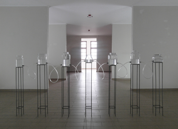 | Nikos Arvanitis Horizon Glass, iron, rubber, silicone, water, 2015 ![]() Exhibition view at the symptom 06: Rims and frontiers, Group Exhibition Old Amfissa Hospital 10. - 25. October 2015 curated by: Evaggelia Ledaki The horizon of Nikos Arvanitis comprises seven glass containers mounted each on a metal stand and interconnected by plastic tubes. This closed system of communicating vessels is like a model that shows the mechanics of aquifers. According to this structure, we must picture the jars as lakers and the tubes as underground flows and springs. The system contains water. The level of water is the same everywhere, running across the entire system and forming a seemingly broken horizon. The cuts and narrow passages do not hinder the flow. Although the vessels are of different sizes and shapes, the fluid forms a straight line. Nikos borrows this equilevel logic from an earlier work by Eftichis Patsourakis with the same title (2011), which was made using pre-existing seascape paintings. The transcription of seascapes into vessels represents an interesting shift: here the painted readymades (the amateur seascapes assembled by Patsourakis in Horizon #6) are turned into industrial containers. The containers make up a self contained system characterized by discontinuous associative transmutations, the delineation of space and a repetitive structure that references the logic of Lacanian topology: the liminality of traversing, continuity through the cut, repetition, return. Text by Evangelia Ledaki. Close Window |